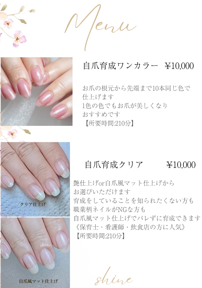 | 当店付け替えオフ (¥3,000) | ネイルを完全にオフし、丁寧な甘皮ケア、 お爪の長さを整え、保湿します 【所要時間:90分程】 |
